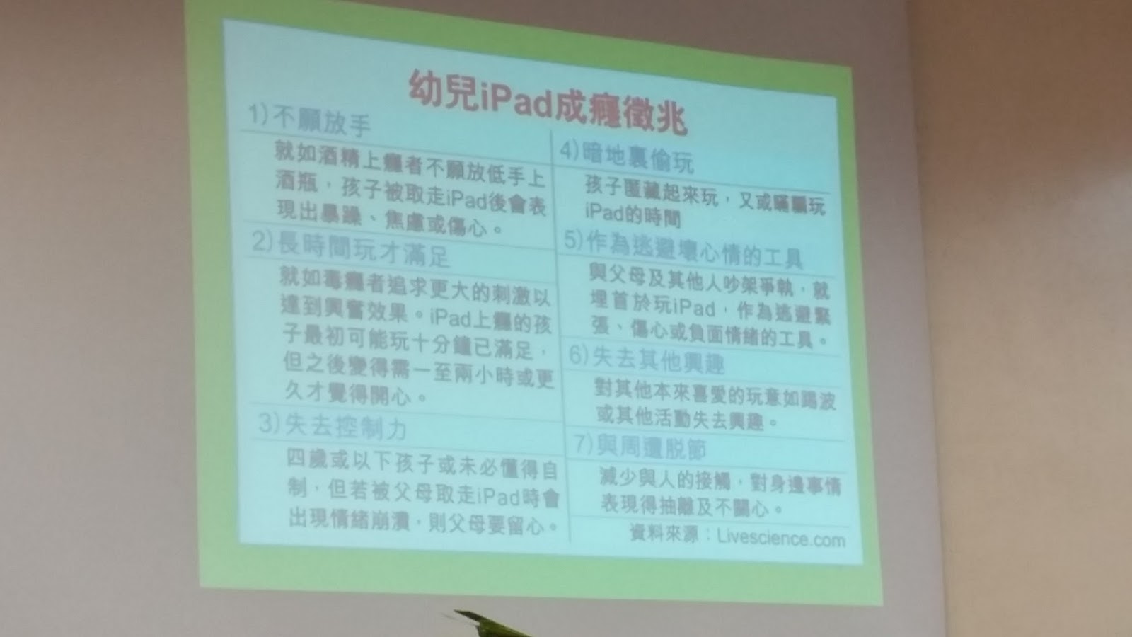 講者強烈建議忌用遊戲機、ipad 類似物品作為獎品,這會引導兒童更迷惑在電玩。沉迷電玩猶如癌症。講者指出如發現幼兒出現第一個症狀便要即時處理,絕不可待第二個或之後的症狀才去處理。